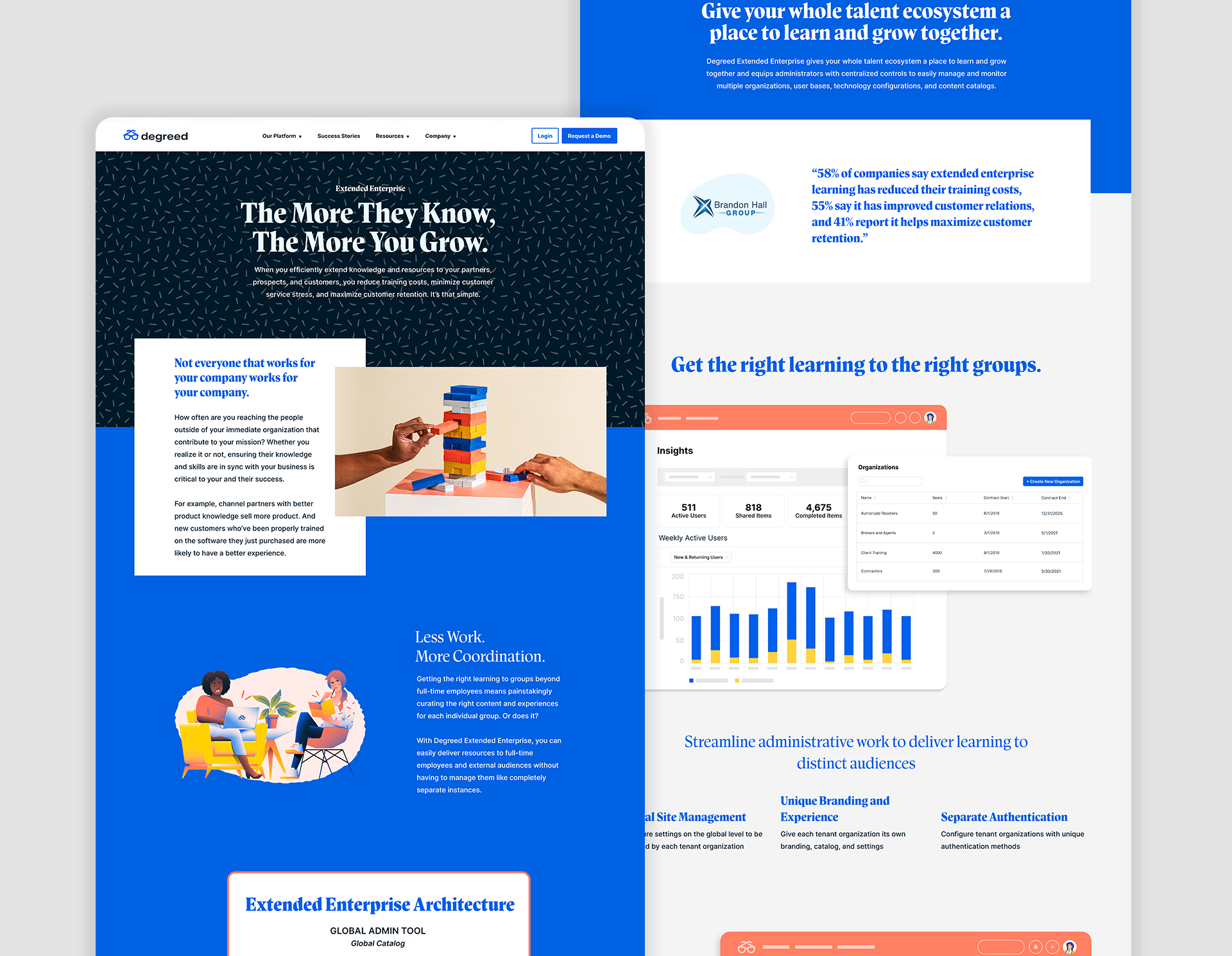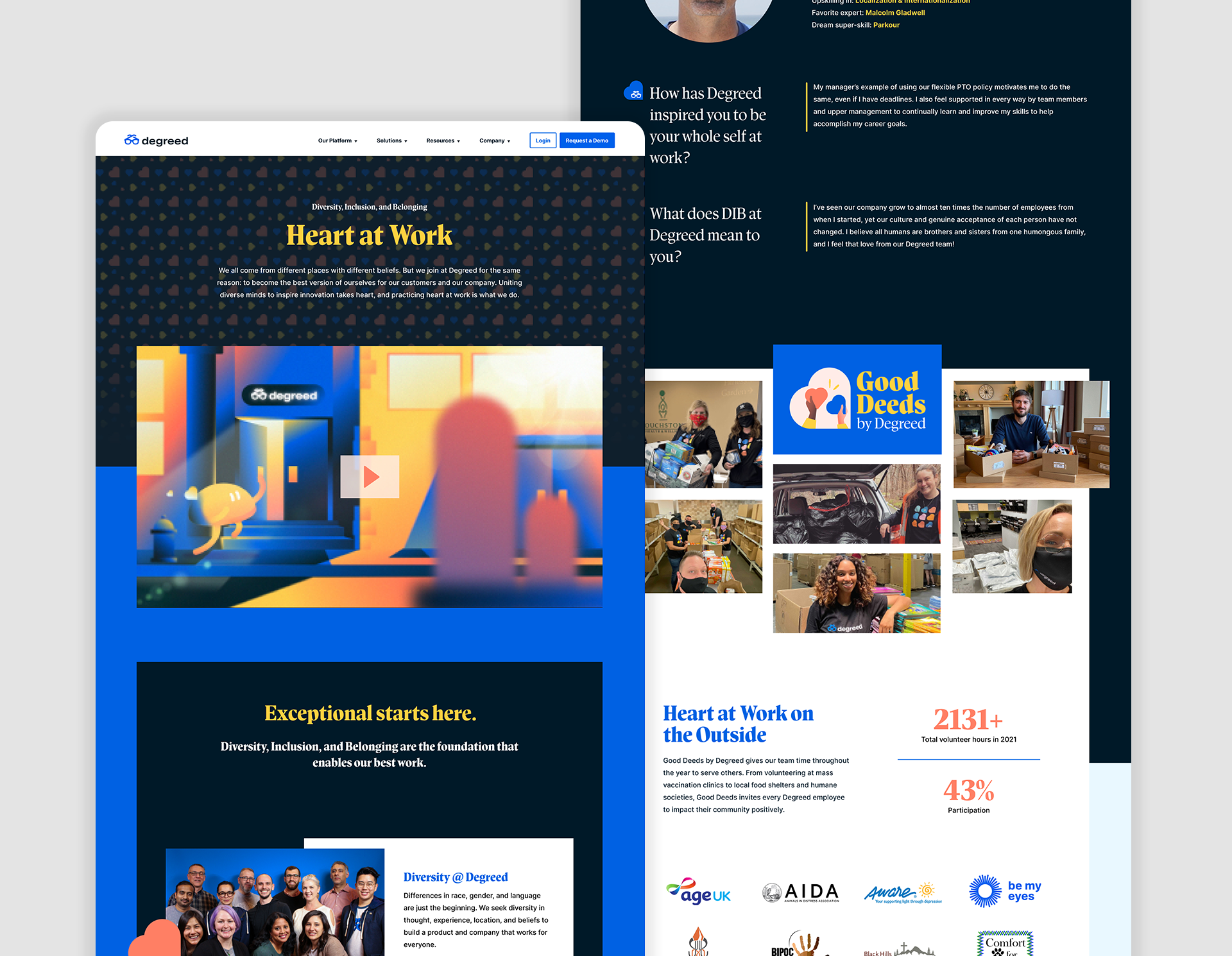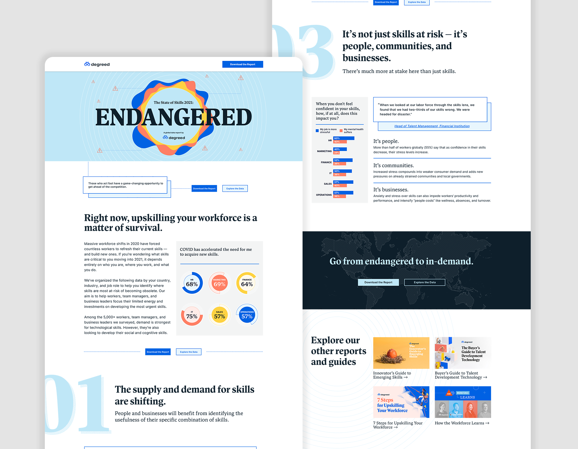 After Degreed’s rebrand, the company needed a new template for their ongoing client case studies. The new template needed to be prioritized for digital viewing and serve both brands. The combination of illustrations, brand photography, and data from the client allowed each case study to fell tailored to the client’s relevant industry and allowed each report to still feel bespoke within the templated layouts.